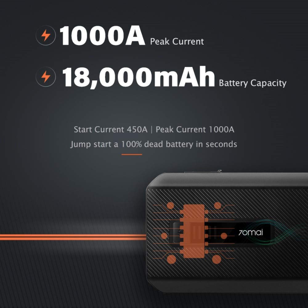 - The 70 Mai Jump Starter Max 18000mAhBattery is your reliable companion for car emergencies. Designed to jump-start 12V vehicles with up to 8.0L gas and 3.5L diesel engines, this powerful device ensures you’re never stranded. With 500A start current and 1000A peak current, it revives dead batteries instantly.