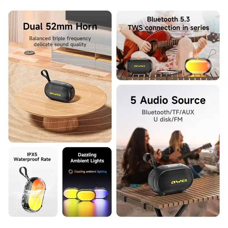 - The Awei KA1 Bluetooth Speaker is a feature-packed audio device designed for dynamic sound and vibrant lighting. With Bluetooth 5.3, it ensures a stable 10m connection, seamlessly linking to any Bluetooth-enabled device. The 360° surround sound delivers immersive audio, making it ideal for parties, gatherings, or personal relaxation.