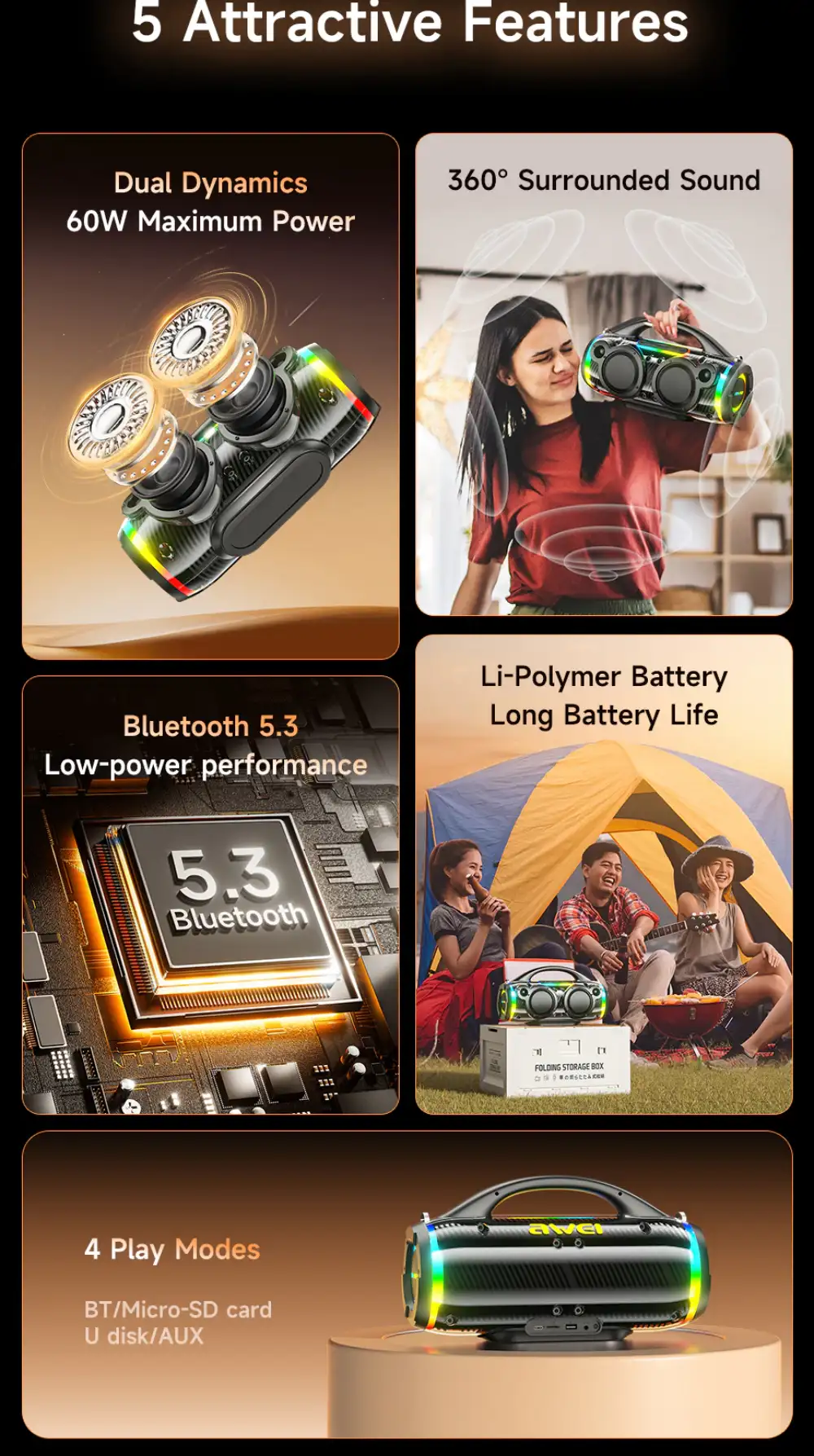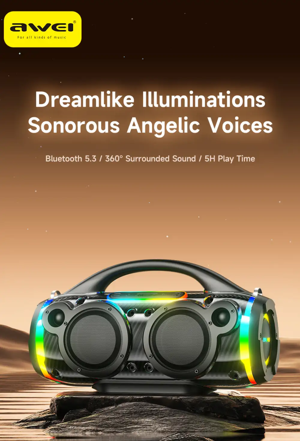 - Upgrade your outdoor audio experience with the AWEI KA12, a 60W Bluetooth speaker built for adventure. Whether you’re camping, hosting a party, or enjoying a picnic, this speaker ensures deep bass, clear highs, and distortion-free sound for an immersive listening experience.