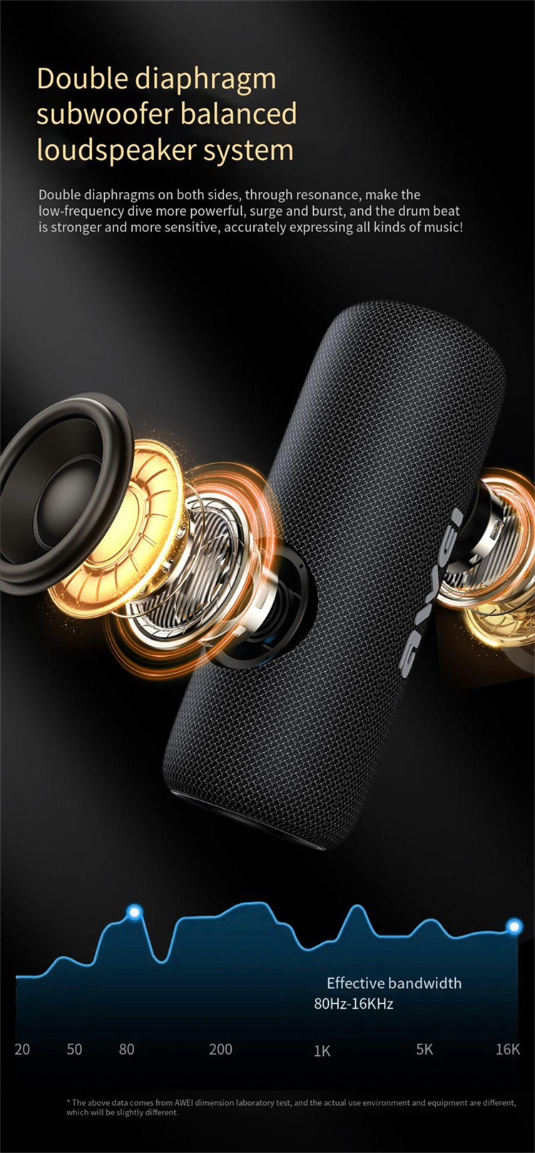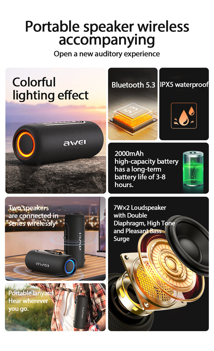 - If you’re looking for a speaker that combines power, portability, and performance, the Awei KA8 is your perfect match. Equipped with the latest Bluetooth 5.3, it ensures a stable and quick connection up to 10 meters, ideal for outdoor adventures, parties, and picnics. With dual 7W speakers, it delivers 360° stereo surround sound, making your music feel vibrant and immersive.