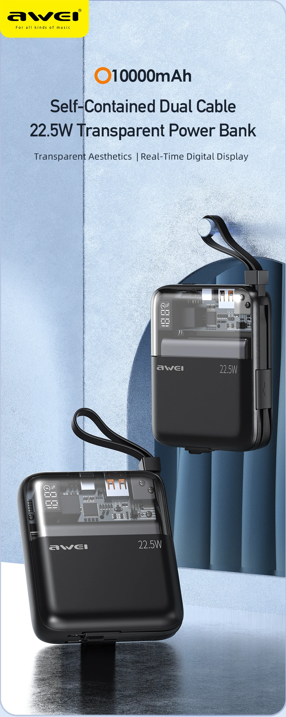 - Convenience is key with the Awei P149K. It features two built-in cables (Type-C and Lightning), eliminating the need to carry extra charging cords. The transparent design allows you to check the remaining battery level easily, while the lanyard ensures portability and ease of use.