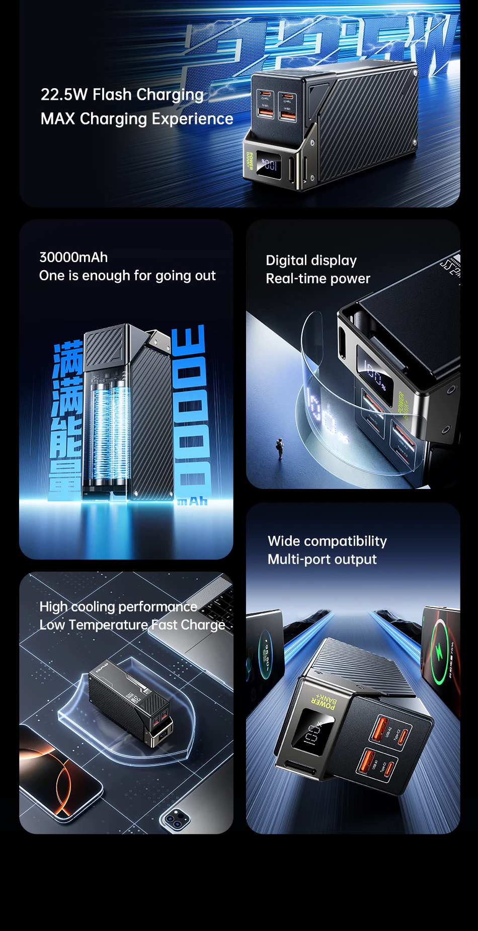 - Equipped with a massive 30000mAh polymer lithium-ion battery, it delivers outstanding performance for smartphones, tablets, and other gadgets. Moreover, with 22.5W fast charging support, you can power up your devices faster than ever before—saving both time and hassle.