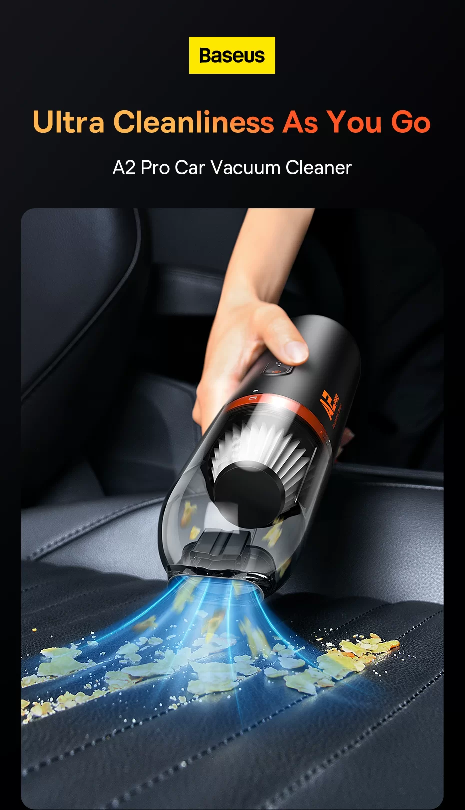 • Keep your car looking brand new with the BASEUS A2 Pro 6000Pa powerful car vacuum cleaner. Designed with high suction power and modern features, this handheld vacuum ensures every corner of your vehicle is spotless. Whether you’re cleaning pet hair, crumbs, or dust, the 6000Pa suction backed by an 80AW motor delivers one-shot deep cleaning.