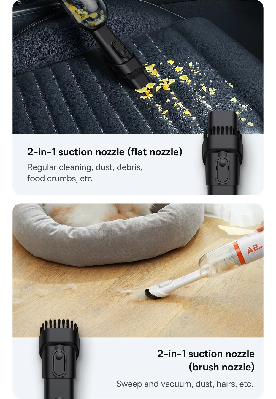 • The BASEUS A2 Pro 6000 Pa also includes a 2-in-1 nozzle system, perfect for cleaning every type of surface. From pet hair to sofa crevices to car seat corners, it handles it all with ease. It even doubles as a blower, allowing you to clean keyboards or blow dust off barbecue surfaces.