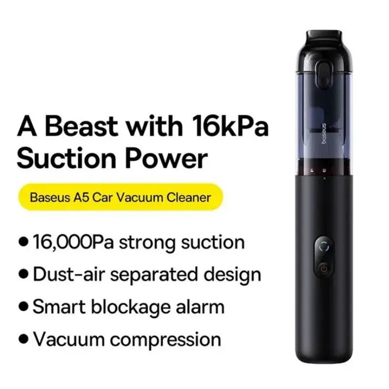 - The Baseus A5 16000Pa Powerful Car VacuumCleaner is designed to deliver high-efficiency cleaning with unmatched portability. With its 16000Pa suction power, it ensures a deep clean, effortlessly removing dust, crumbs, pet hair, and debris from your car and home. Whether it’s tight corners, carpets, or seats, this vacuum handles it all with ease.