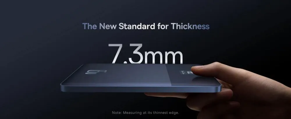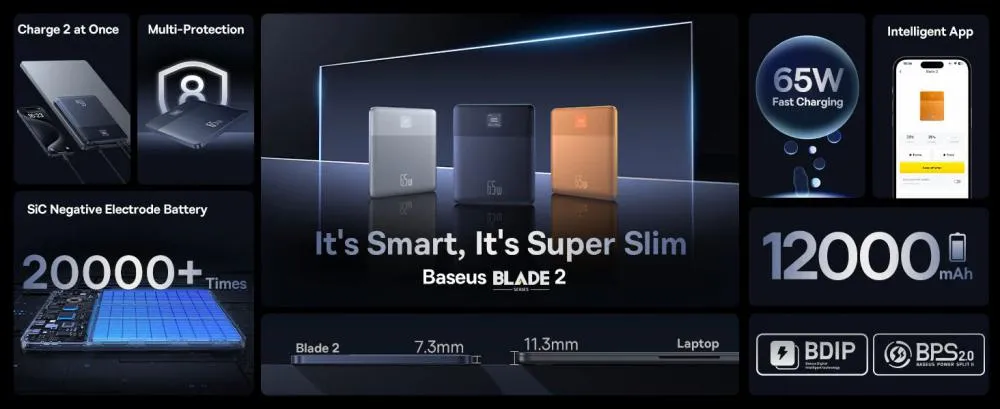 • One of the standout features of the Baseus Blade 2 is its ultra-thin design, measuring only 7.3mm at its slimmest point. This sleek profile makes it incredibly portable, easily slipping into a laptop bag or travel pouch. Whether you’re on a cruise, exploring Europe, or catching a long flight, this power bank ensures you’re always prepared.