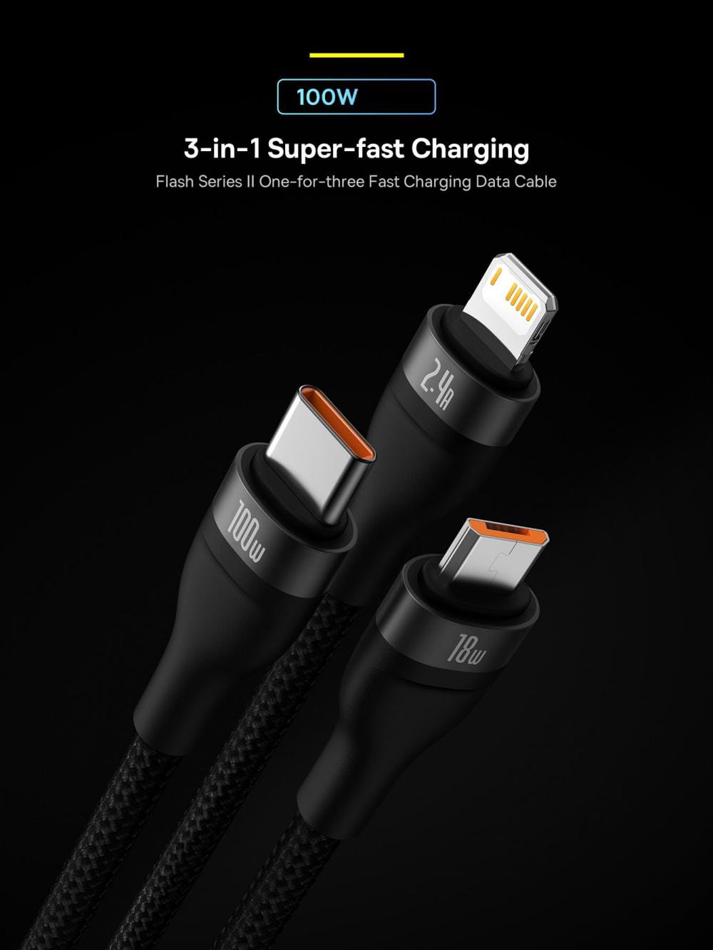 - The Baseus Flash Series II 100W One-for-three Fast Charging Data Cable is a versatile and powerful charging solution that simplifies your device connectivity. With a 1.2-meter nylon-braided cable, it is built for durability, ensuring longevity even with daily use. Designed for convenience, this cable features three output options—Micro USB, Lightning, and Type-C—allowing you to charge multiple devices simultaneously without compromising speed. Whether you’re charging a smartphone, tablet, or other compatible gadgets, you’ll experience the convenience of fast and efficient charging.