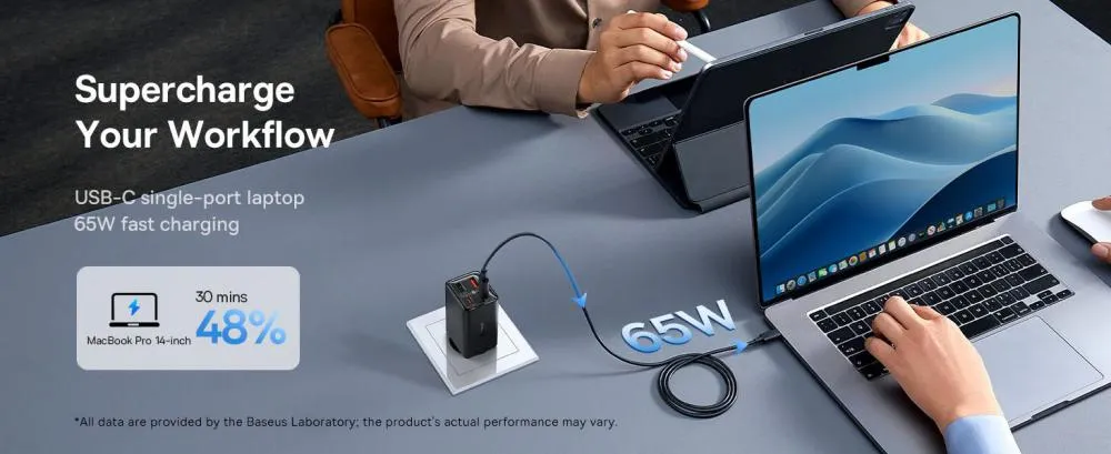 - With a powerful 65W output, the Baseus GaN6 Pro can fast-charge a MacBook Pro 16 from 0% to 80% in just one hour, saving you valuable time. Its advanced GaN6 technology ensures efficient energy conversion while keeping the device cool, providing a safer and more reliable charging experience. Additionally, the charger supports a wide range of devices, making it compatible with laptops, tablets, smartphones, smartwatches, and more.