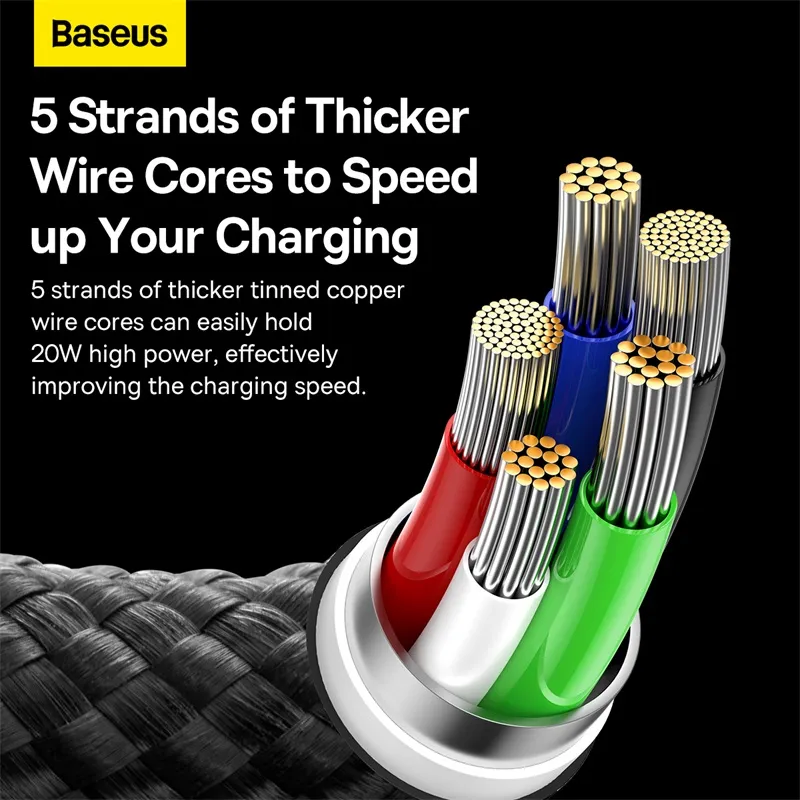 - The Baseus Glimmer Series Fast Charging Data Cable USB to Type-C 100W designed to meet your charging and data transfer needs, providing both speed and reliability. First, let’s talk about the fast charging capabilities. The Baseus Glimmer cable supports 20W Power Delivery fast charging technology, allowing your Apple device’s battery to reach 50% in just 30 minutes. Comparatively, standard cables would only bring your device to about 20% within the same timeframe. Moreover, the cable ensures that a low temperature maintained even while you use your device for activities like gaming, watching movies, or broadcasting, so you don’t have to worry about overheating. Additionally, the cable automatically transitions into a sustained charging mode to further protect your device’s battery.