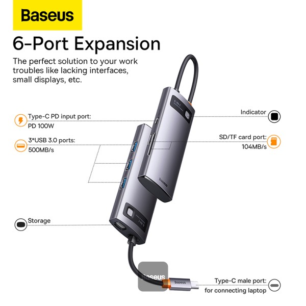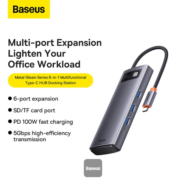 - The Baseus Metal GleamSeries 6-in-1 Multifunctional Type-C HUB is the ultimate solution for expanding your laptop’s connectivity while ensuring top-notch performance. Crafted from premium aluminum alloy with a sandblasting and anodizing finish, this compact and stylish hub is designed for professionals who need efficiency on the go.