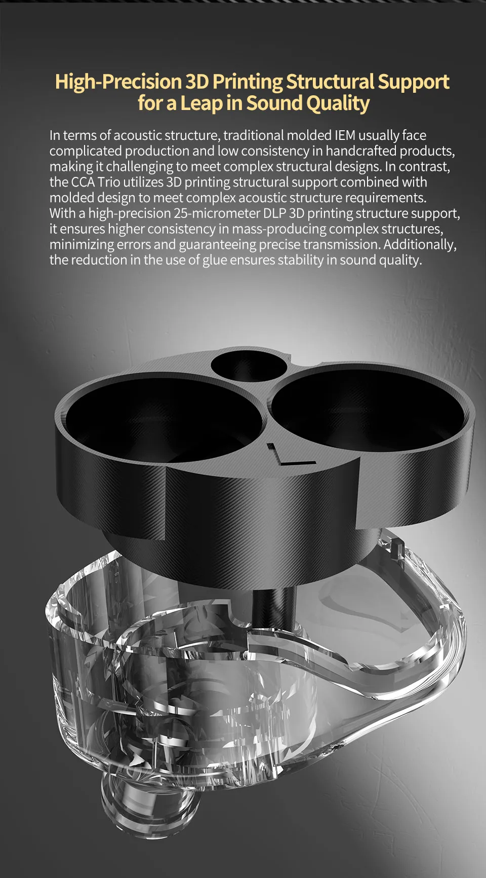 - Ideal for audiophiles and casual listeners alike, the CCATrio IEM earphones and IEM headphones offer exceptional sound, customization, and comfort. Whether at home, on the go, or in the studio, the CCA Trio guarantees a superior auditory experience.