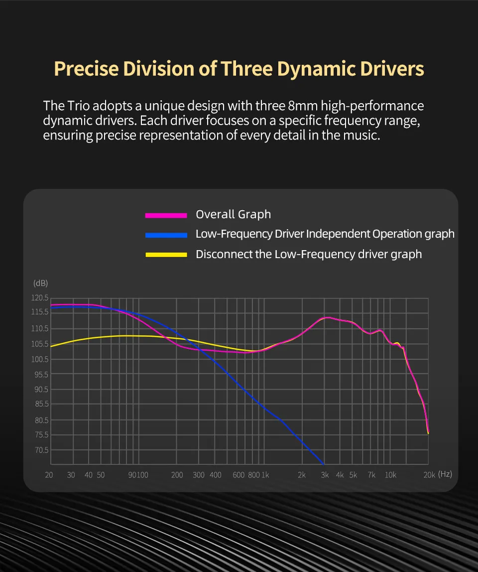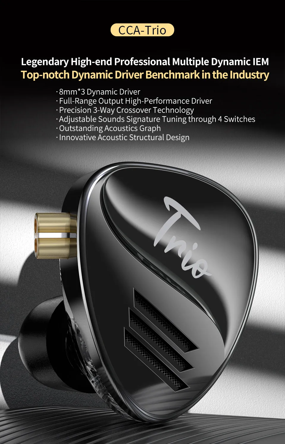 - The CCA Trio stands out as a revolutionary in-ear monitor (IEM) designed for audiophiles seeking premium sound quality and comfort. Equipped with three 8mm dynamic drivers, the earphones deliver high-performance, full-range output. These drivers are meticulously tuned to cover the complete audio spectrum, offering deep bass, clear mids, and crisp highs, ensuring a truly immersive experience for music lovers.