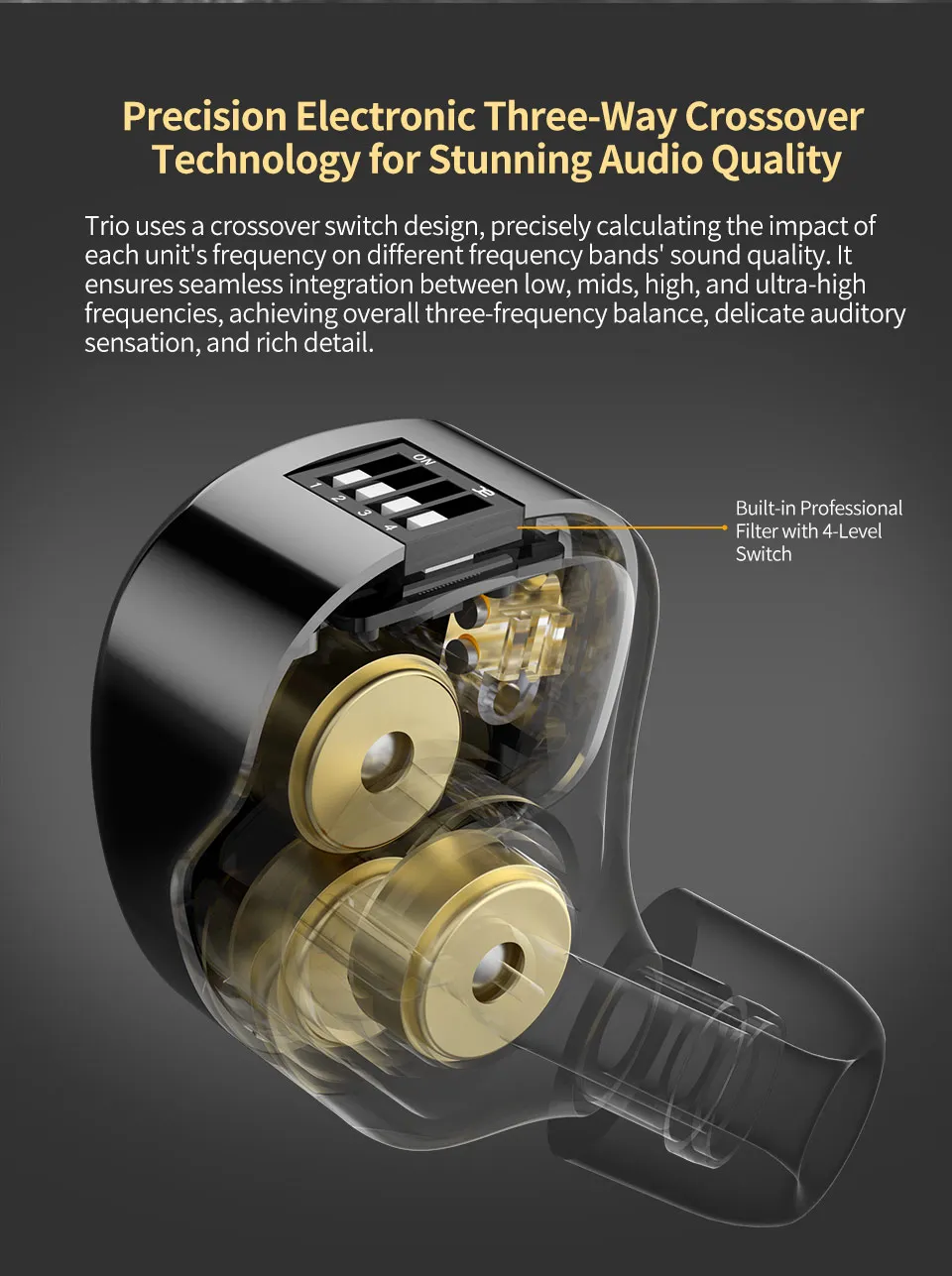 - Featuring advanced precision three-way crossover technology, the CCATrio separates bass, mid, and high frequencies flawlessly. Each frequency is allocated to its dedicated driver, reducing interference and delivering a pure, balanced sound. Whether you’re enjoying classical melodies or bass-heavy tracks, these IEM headphones stay faithful to the original recording.