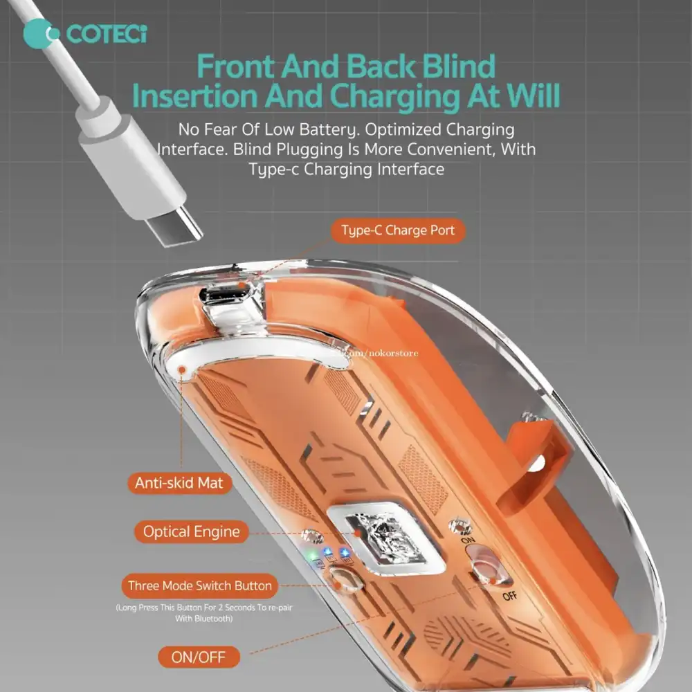 - Experience next-level productivity with the Coteci Magic Crystal II Three Mode Wireless Mouse, a perfect blend of style, performance, and comfort. Designed to adapt to your lifestyle, this advanced wireless mouse supports three versatile connection modes—Bluetooth, 2.4GHz wireless, and wired—ensuring a seamless switch between your laptop, tablet, or smartphone. Whether you’re working on Windows, macOS, Android, or iOS, this mouse has you covered.