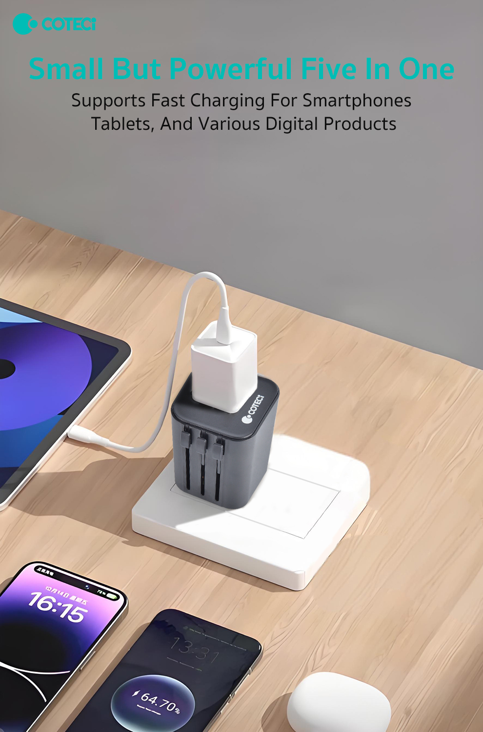 - In terms of safety, the COTECi travel adapter includes a built-in fuse system and multiple protection mechanisms to prevent over-current and enhance secure use. While it lacks USB-A or USB-C ports, it serves as a reliable solution when paired with your regular charger.