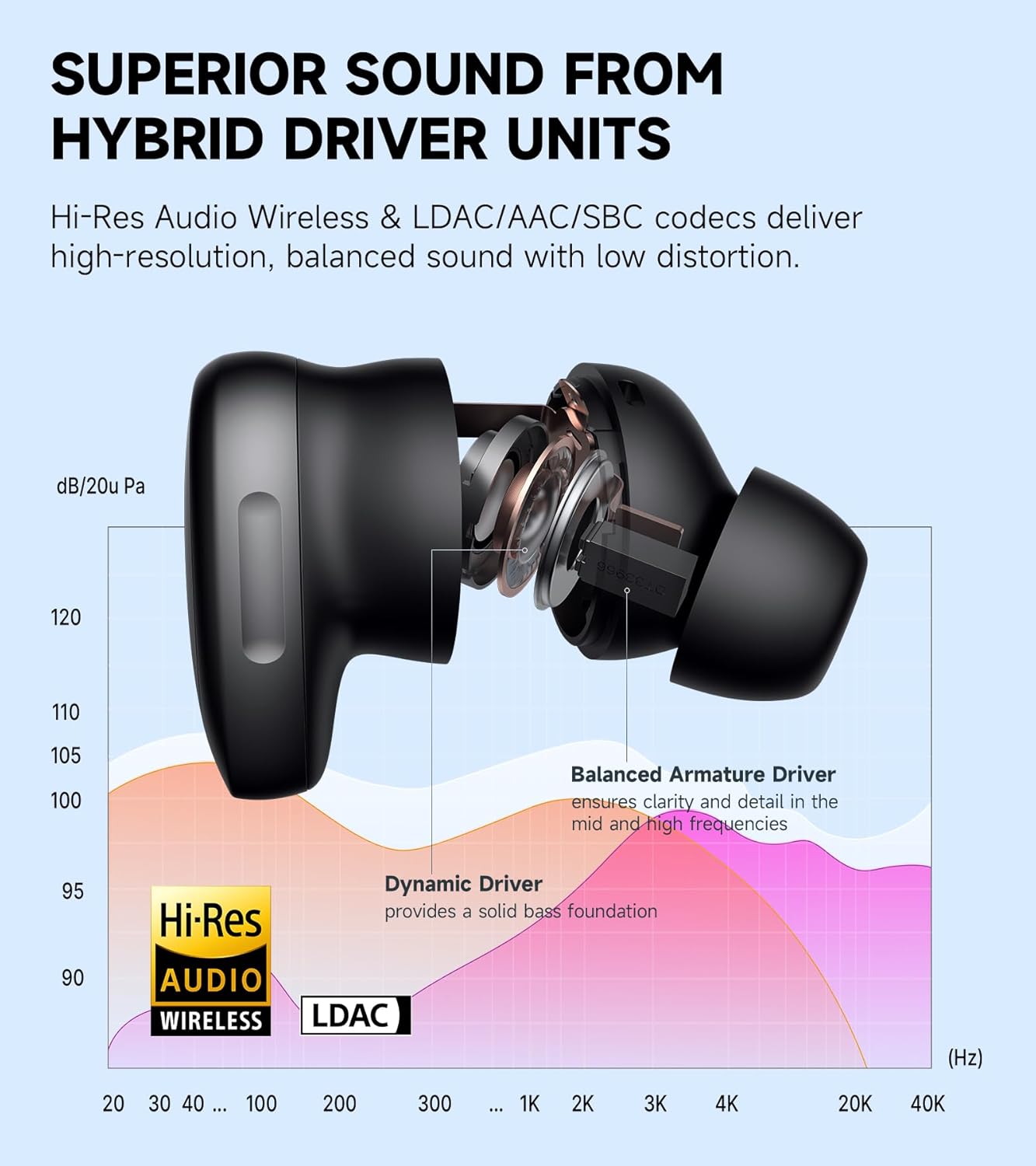 - Battery life is another strong point. With ANC off, enjoy up to 56 hours of playtime (17h earbuds + 39h case), and up to 40 hours with ANC on. A quick 15-minute charge gives up to 5 hours of playback. These earbuds support LDAC, AAC, and SBC audio codecs for superior streaming quality via Bluetooth 5.4, and with multipoint connectivity, you can switch between two devices seamlessly.