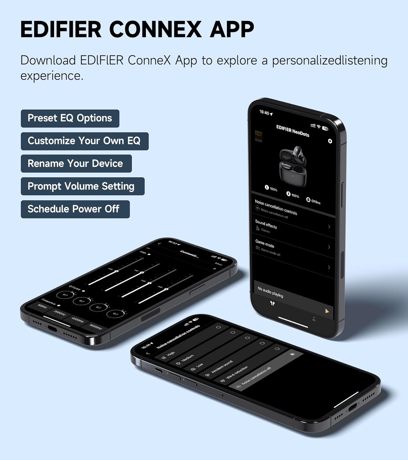 - The standout feature is the -48dB Hybrid Active Noise Cancellation, effectively blocking out ambient sounds from noisy environments like city streets or public transport. With three ANC levels and an ambient mode, the Edifier NeoDots adapt to your surroundings. Plus, the six microphones (3+3) with AI-powered beamforming ensure crystal-clear call quality even in windy conditions up to 25 km/h.