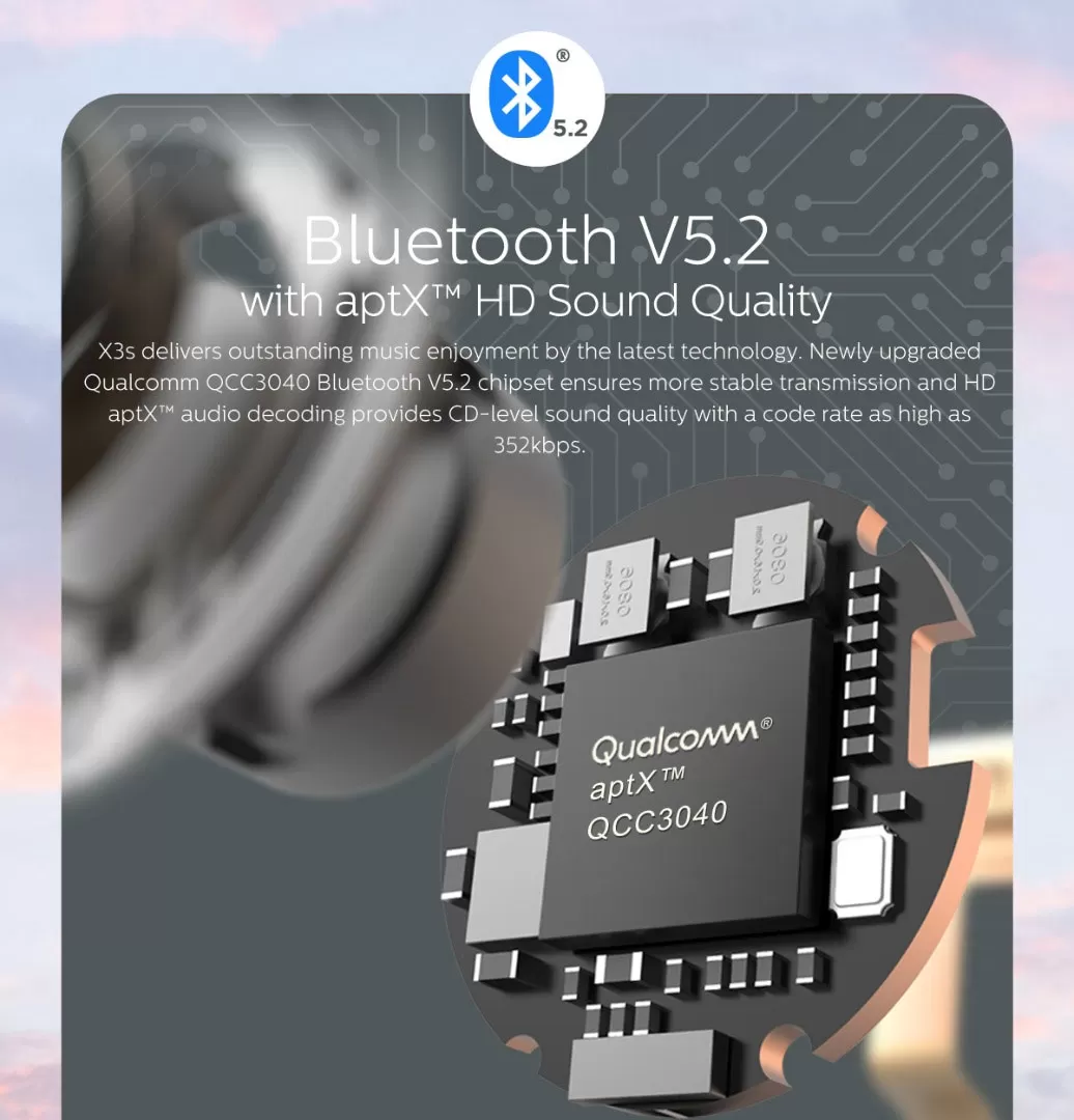 - Equipped with the advanced Qualcomm QCC3040 Bluetooth V5.2 chipset, the EdifierX3S ensures stable connectivity and superior audio clarity. The aptX™ codec delivers near-CD sound quality, with a high data rate of 352kbps—perfect for audiophiles.