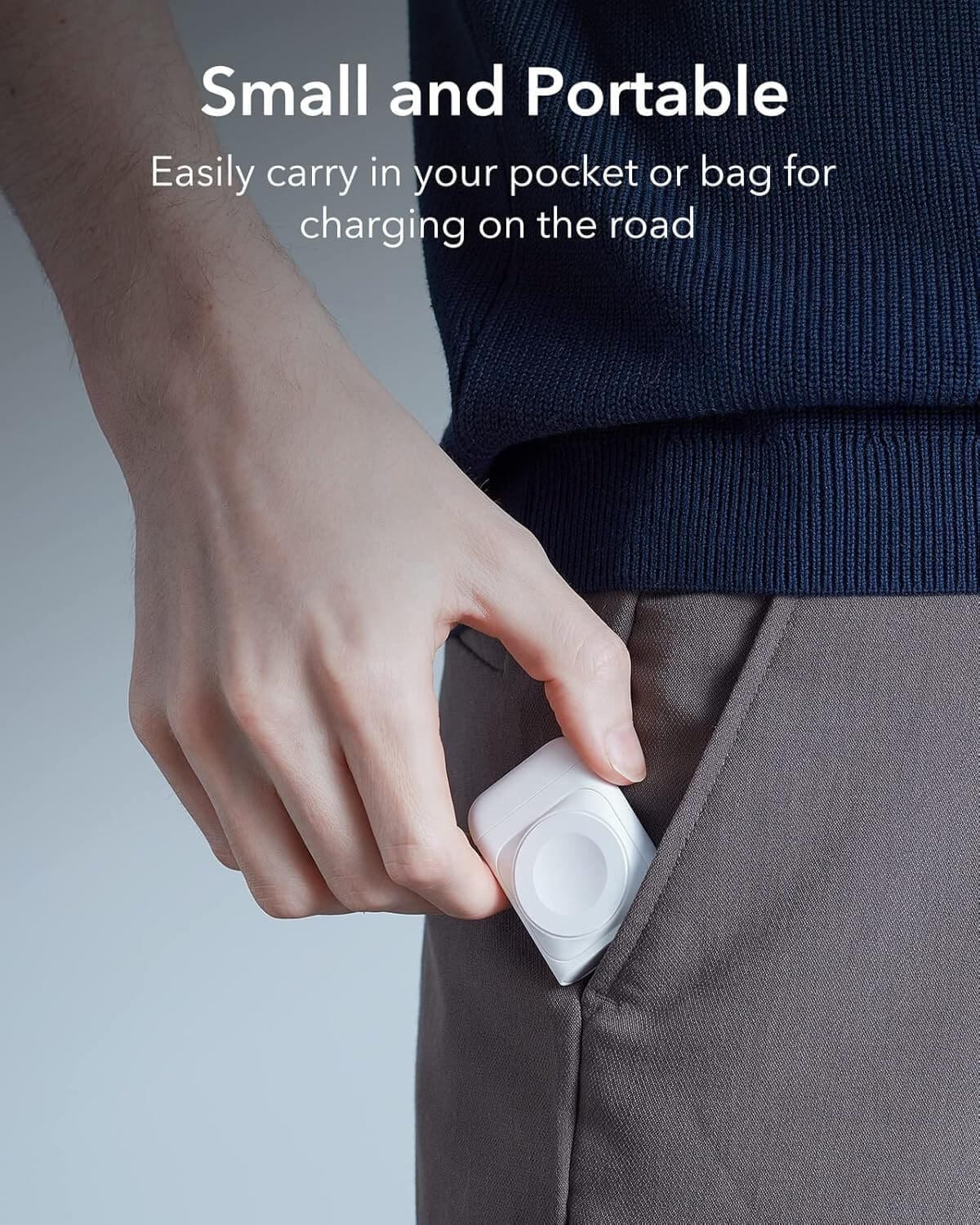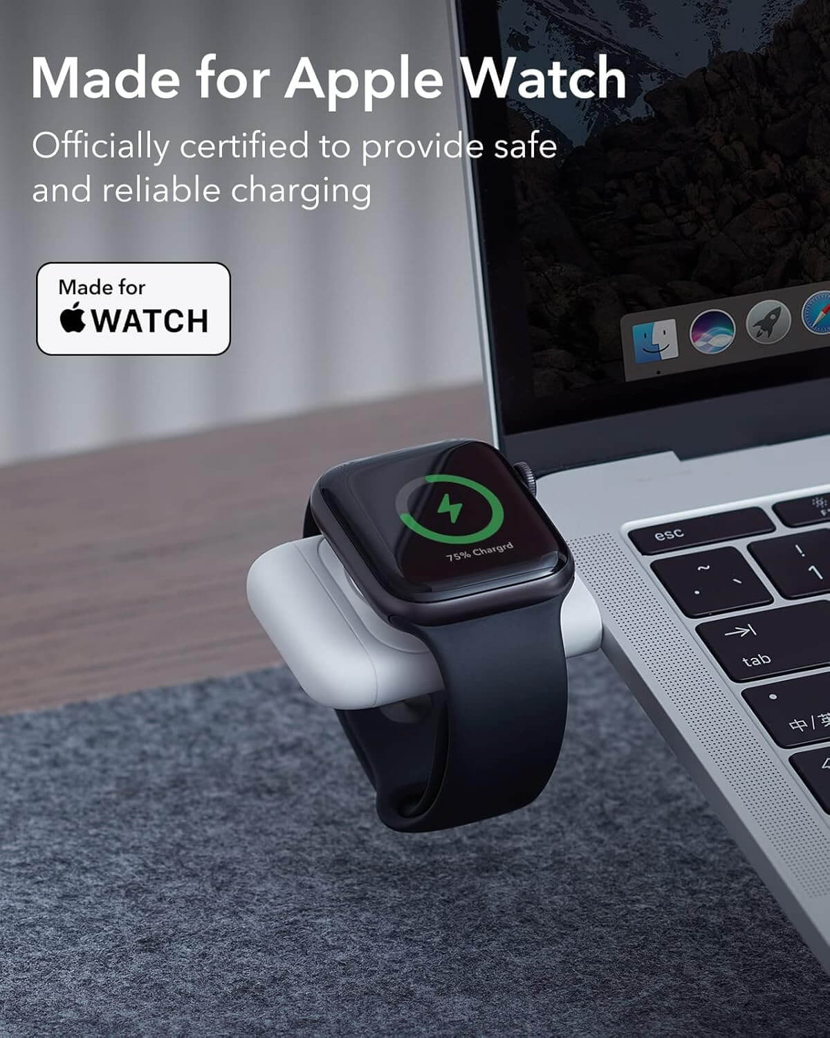 - The ESR Portable Charger for AppleWatch is the perfect solution for seamless charging on the go. Officially certified for Apple Watch, this charger guarantees safe and reliable fast magnetic charging, ensuring your device always powered up. Its compact and portable design allows it to easily fit in your pocket or bag, making it an ideal companion for travel or daily use. The magnetic cover securely attaches to the back, so you never have to worry about misplacing it.