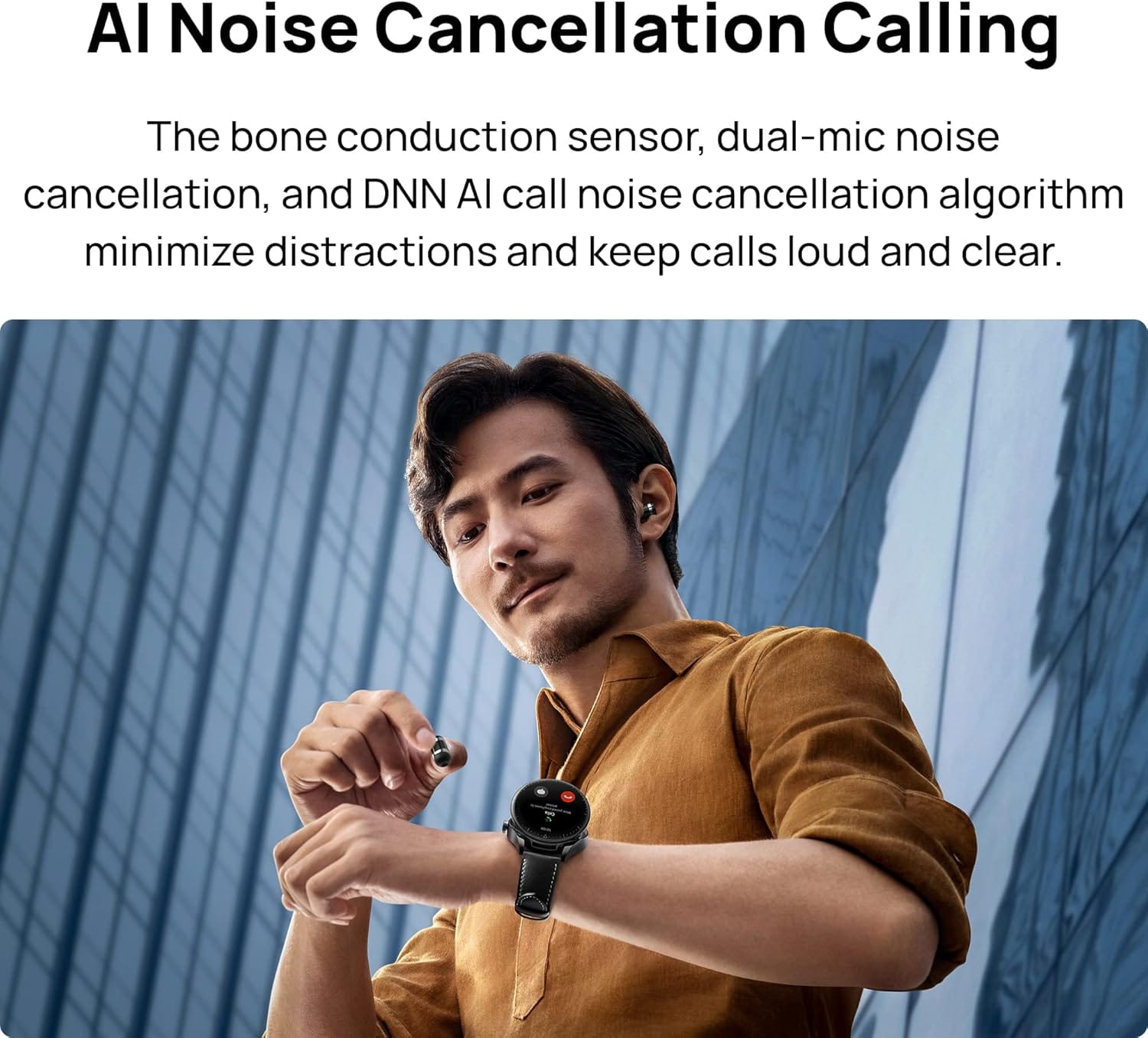 - Speaking of noise cancellation, the Huawei Watch Buds SmartWatch excels with AI Noise Cancelling for Calls. Thanks to its bone conduction sensor, dual microphones, and DNN AI algorithm, background noise is minimized for crystal-clear conversations.