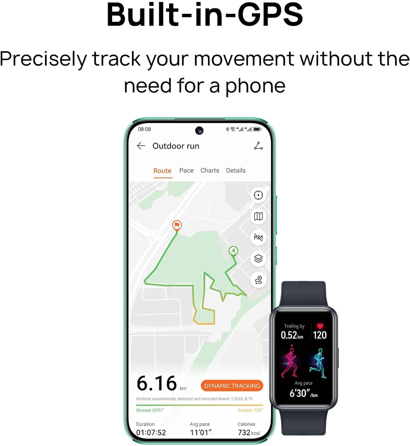 - For fitness enthusiasts, the built-in GPS ensures accurate tracking of outdoor activities like running, walking, or cycling, eliminating the need to carry your phone. Whether you’re using an Android or iOS smartphone, the Huawei Watch Fit SE offers seamless compatibility for hassle-free connectivity.