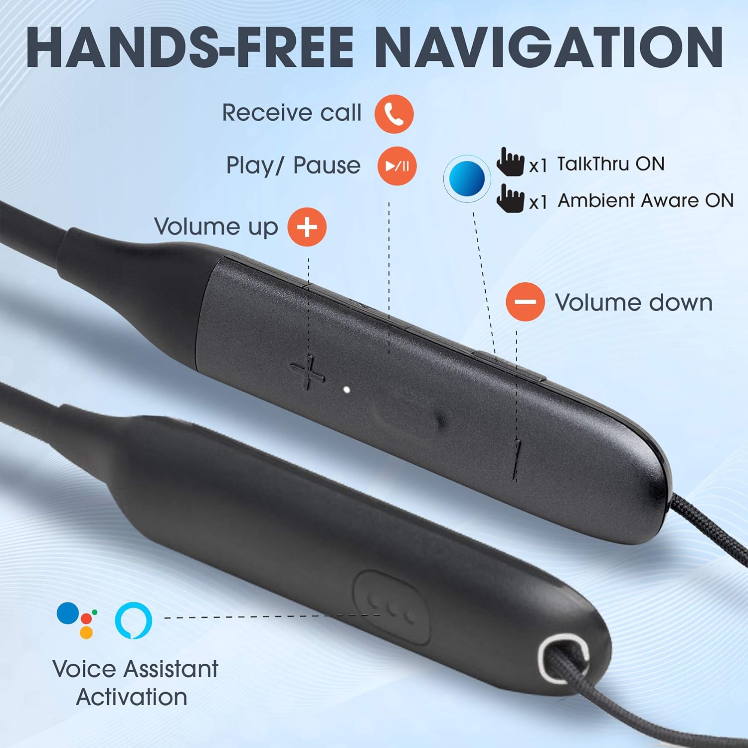 - The Ambient Aware and TalkThru technologies make this neckband even smarter. Ambient Aware lets you increase surrounding sounds to stay alert in busy environments, while TalkThru lowers the music level so you can easily chat with friends without removing your headphones.