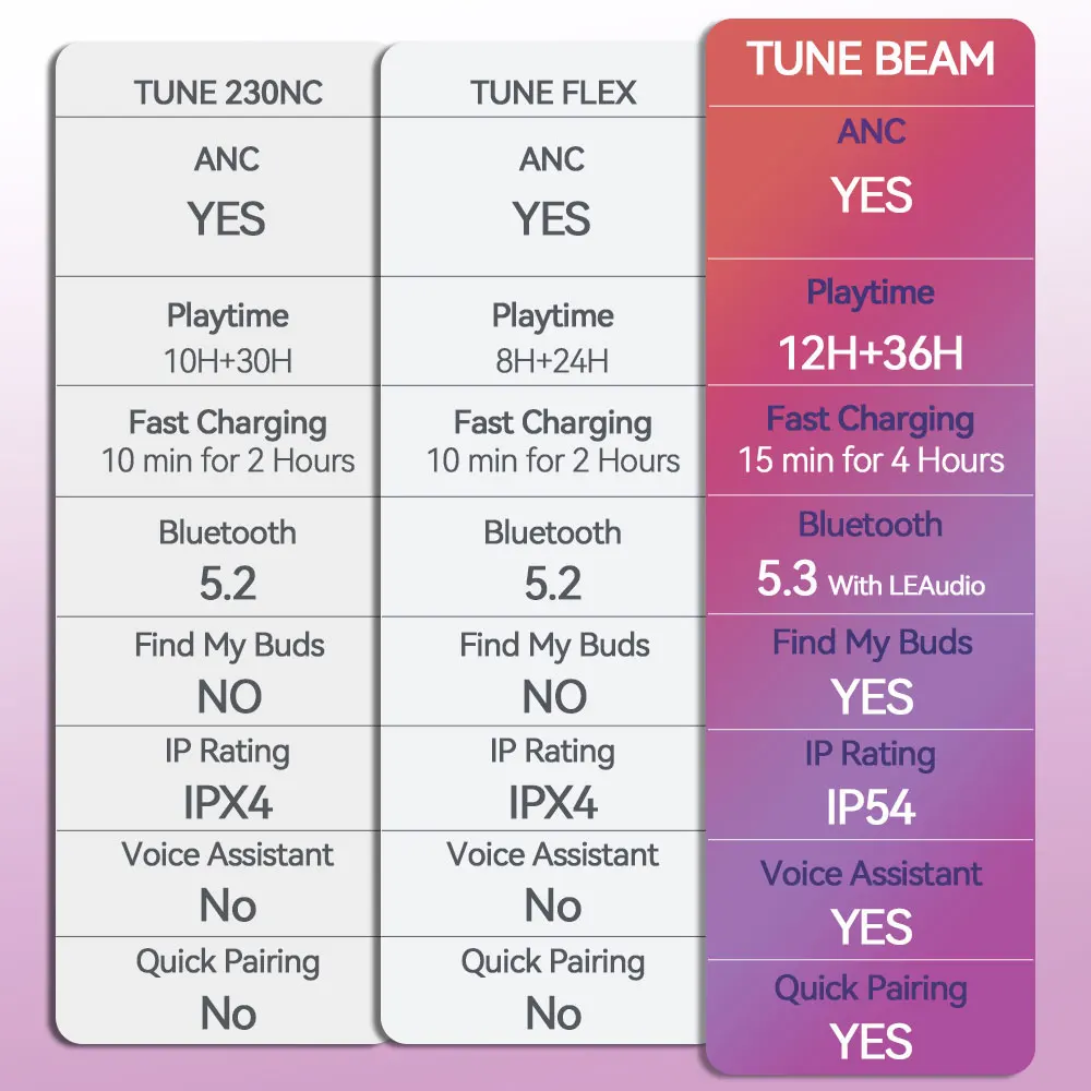 - Bluetooth 5.3 with Low Energy Audio Support:Get ready for a seamless listening experience. The Tune Beam utilizes the latest Bluetooth 5.3 technology, offering not only a stable connection but also lower power consumption. Additionally, LE Audio support paves the way for the future of wireless audio, promising improved sound quality while maintaining efficient battery usage. This next-generation Bluetooth technology allows for independent audio streaming to each earbud, providing greater flexibility in how you use them.