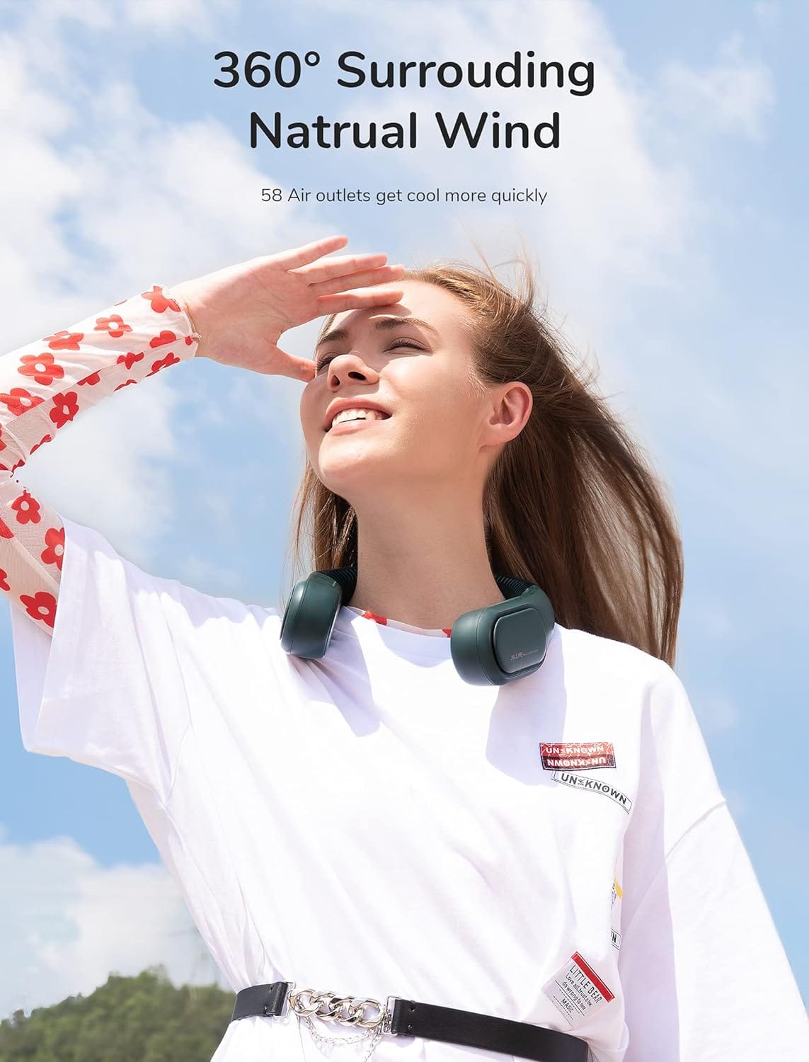 - The JISULIFE FA12R Bladeless Neck Cooler is the perfect companion for those seeking comfort on the go. With its sleek and lightweight design, this upgraded version is easy to wear around your neck, ensuring you stay cool without any hassle. Additionally, its hands-free operation allows you to go about your activities while still enjoying a refreshing breeze. Furthermore, the fan’s bladeless twin turbine technology ensures a smooth and quiet airflow, making it both efficient and comfortable to use.