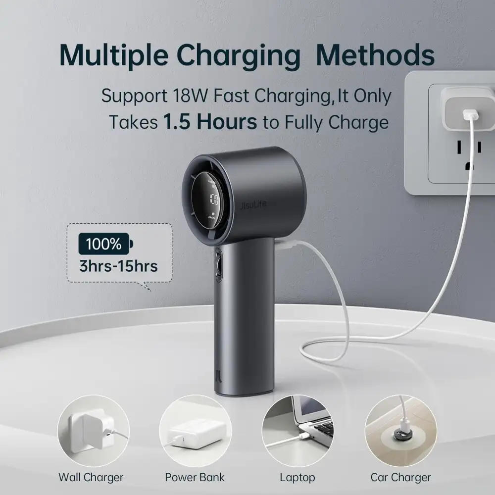 - Powered by a three-phase high-performance motor, the JisuLife HandheldFan Pro1 delivers wind strength comparable to a hairdryer, ensuring rapid cooling even on the hottest days. Its turbocharged wind guide further enhances performance by directing airflow efficiently through a wide outlet, providing a strong and concentrated breeze.