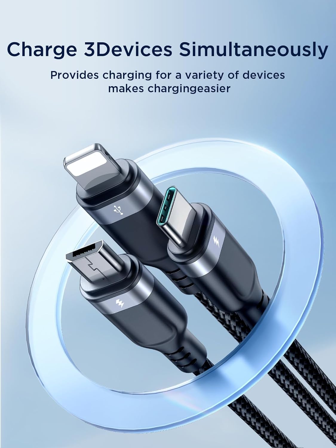 - Charge Multiple Devices Simultaneously: With three connectors in one cable, you can charge up to three devices at the same time, eliminating the need for multiple charging cables. This feature makes it an ideal solution for families, professionals, and frequent travelers.