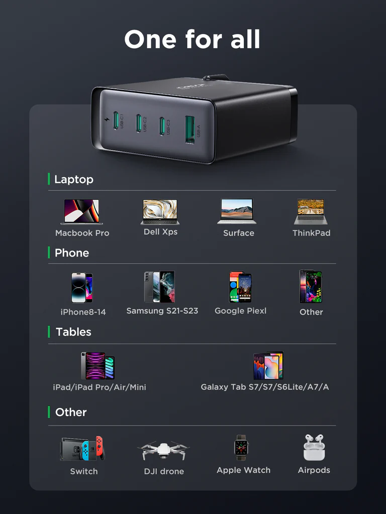 - Powerful Multi-Device Fast Charging: With 4 charging ports (3 USB-C & 1 USB-A), the Joyroom TCG05 GaNUltra supports PD3.1, PPS, QC3.0, Samsung AFC, and Huawei FCP/SCP protocols, making it compatible with laptops, tablets, smartphones, and more.