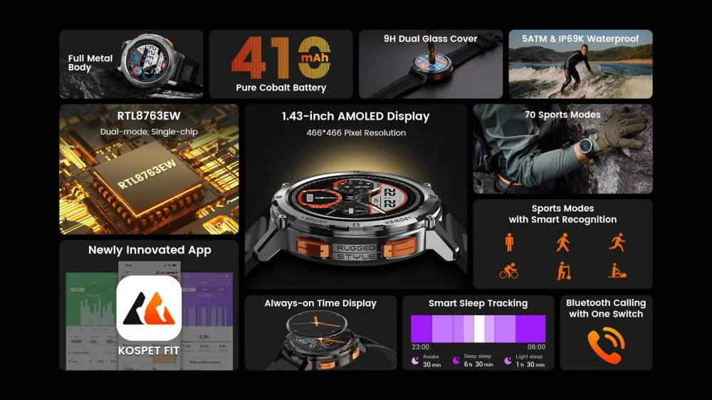 - Equipped with a large AMOLED Retina display, the KOSPET TANKT2 offers vibrant visuals with excellent clarity. The 9H dual cover glass further enhances durability, protecting the screen from scratches and potential damage. For seamless communication, the smartwatch features Bluetooth calling with HIFI audio technology, allowing you to make and receive calls with crystal-clear sound quality.
