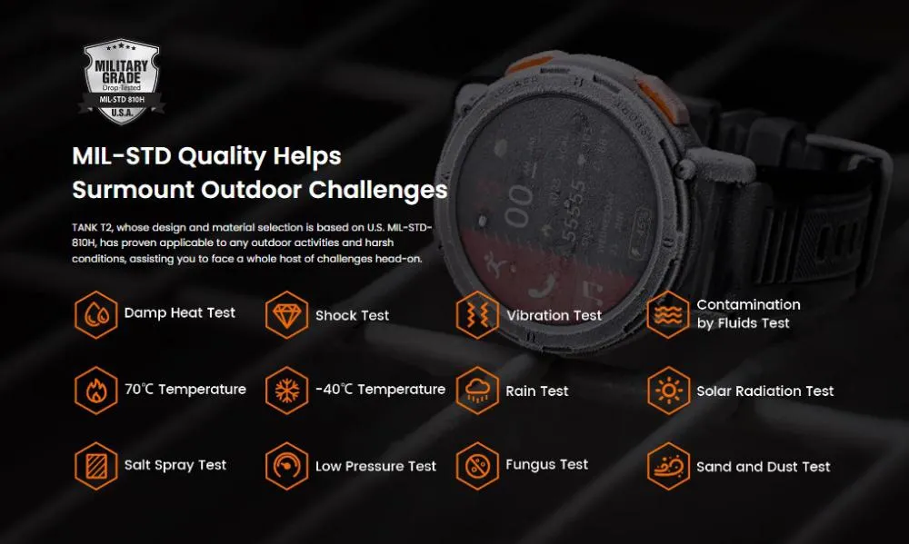 - The KOSPET TANK T2 smartwatch is a perfect blend of toughness and advanced functionality, making it ideal for outdoor and fitness enthusiasts. Engineered with military-grade durability, it complies with MIL-STD-810H standards, ensuring resilience against extreme temperatures, shocks, and impacts. Whether you’re hiking in rugged terrain or exploring underwater adventures, its 5ATM and IP69K water resistance certifications provide unmatched protection, even during heavy rains or deep dives.