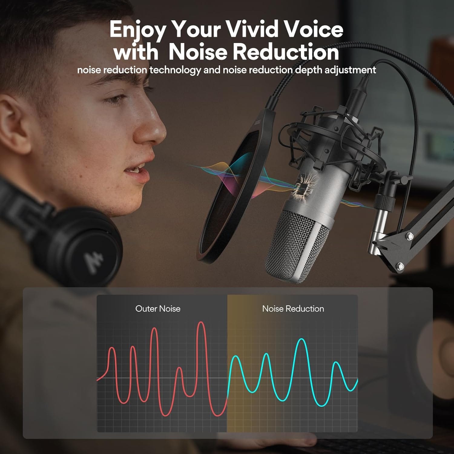 - For enhanced clarity, the microphone comes with a pop filter and a foam windscreen that effectively reduce plosive sounds and background noise. Additionally, the metal shock mount holds the microphone steady while damping vibrations, ensuring smooth and distortion-free recordings.