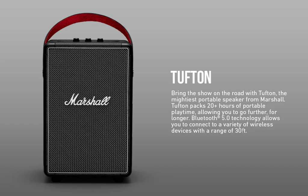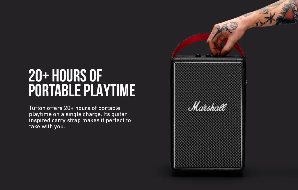 - The Marshall Tufton Portable Bluetooth Speaker is designed for those who demand excellent sound quality and rugged portability. Delivering over 20 hours of playtime on a single charge, this speaker ensures your music never stops, whether you’re indoors, at a party, or exploring the outdoors. Its guitar-inspired carry strap enhances style while making it easy to transport.