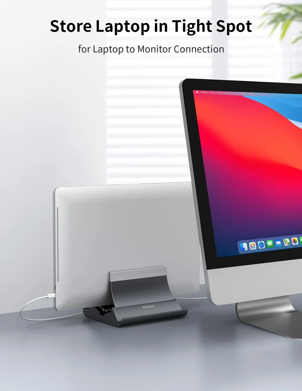 - For those looking to eliminate desktop clutter and establish a more efficient and well-organized workstation, the MOMAX KH17 Arch 3 Laptop Vertical Stand is the ideal choice due to its dual usefulness, compact design, and easy-to-use features.