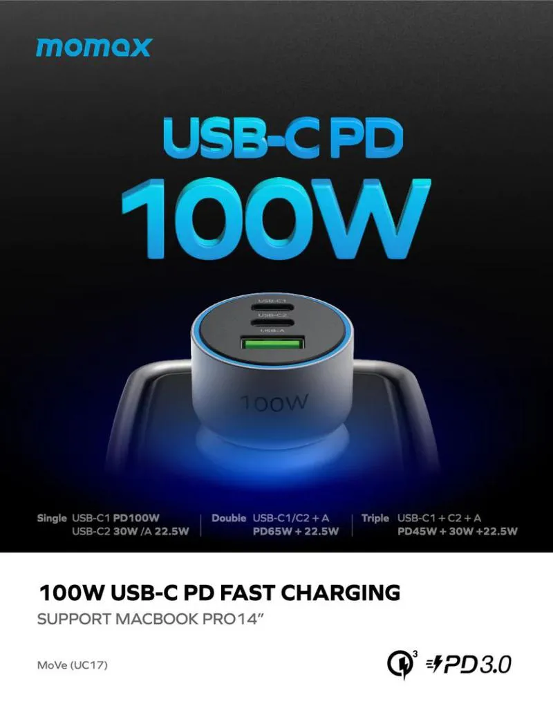 - Explore unparalleled charging efficiency with the Momax UC17 MoVe 100W Car Charger, designed to power up all your devices effortlessly. With its triple-port design and robust 100W power capacity, this charger is perfect for professionals, families, and tech enthusiasts. Whether you’re on the go or taking a road trip, stay connected with the convenience of simultaneous fast charging.