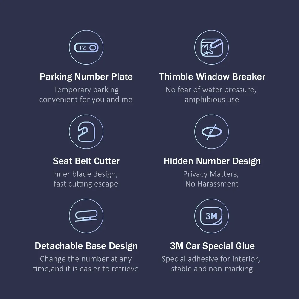 - This multifunctional parking plate features a Thrive pin-type window breaker, engineered for both land and amphibious use. Built to work even under water pressure, it can easily shatter car windows during emergencies. In addition, the built-in seat belt cutter with an inner blade design allows for rapid release from entrapment, making it a must-have in any vehicle.