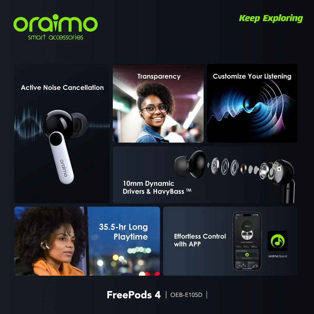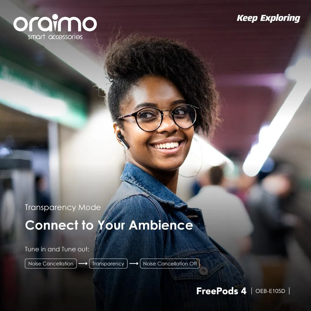 - The Oraimo FreePods 4 ANC True Wireless Earbuds (OEB-E105D) offer a variety of advanced features designed to enhance your listening experience. First and foremost, the Active Noise Cancellation (ANC) system can eliminate up to 30dB of noise, providing a quiet and immersive environment. Whether you are commuting, working, or simply relaxing, you can slide them on, press play, and enjoy true tranquility. Moreover, the Transparency Mode allows you to reconnect with your surroundings effortlessly, letting you switch between tuning in and tuning out as needed.