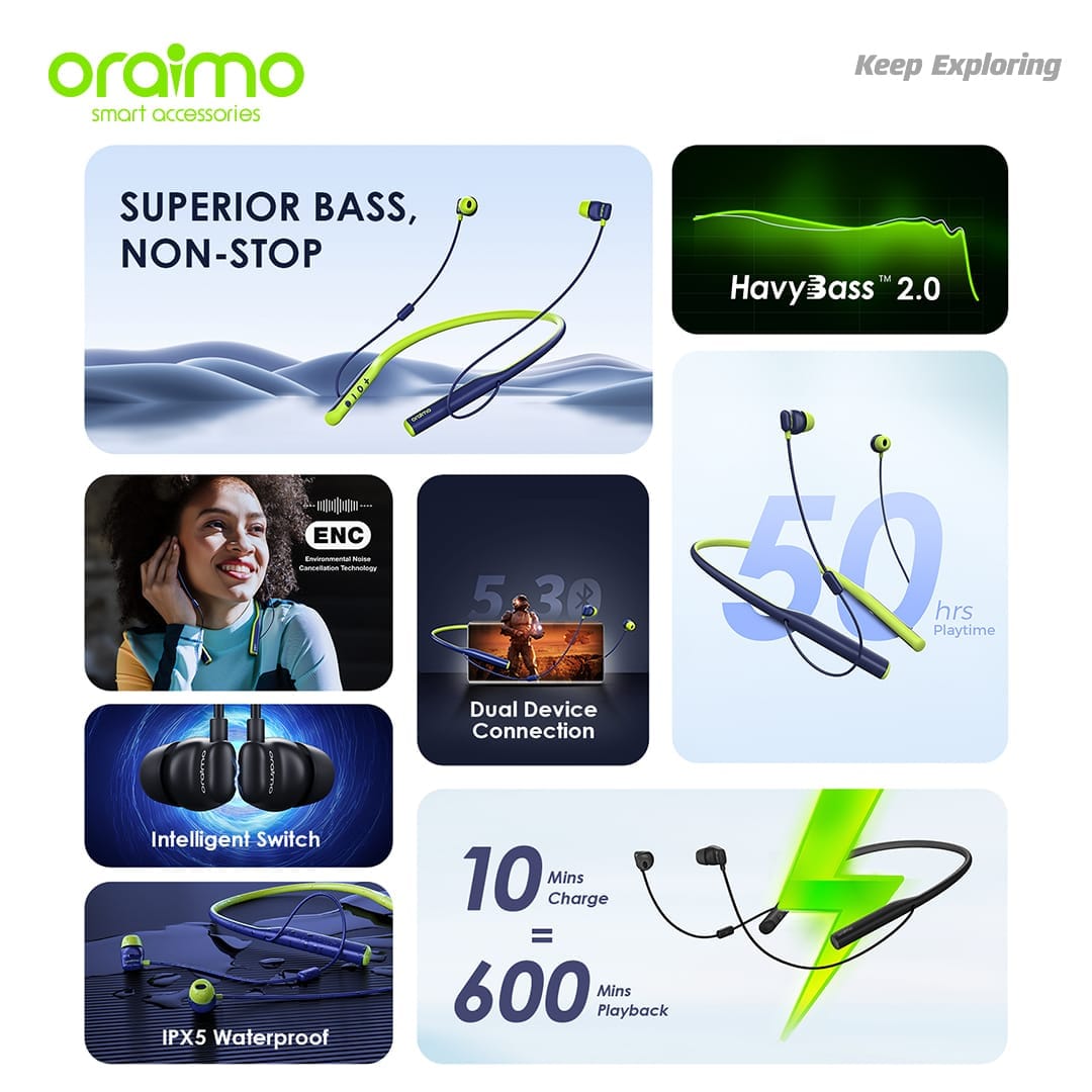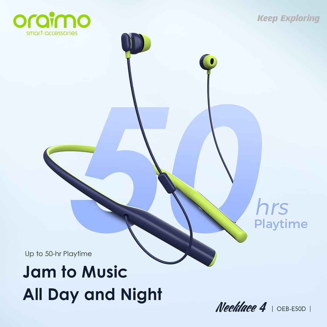 - The Oraimo Necklace 4 Wireless Neckband (OEB-E50D) a remarkable audio accessory designed for extensive music playtime and clear communication. With an impressive playtime of up to 50 hours, you can enjoy your favorite tunes all day and night, requiring only a single charge per week. Additionally, its fast-charging feature ensures that just 10 minutes of charging can deliver up to 10 hours of music, so you can keep the beats going without lengthy interruptions.