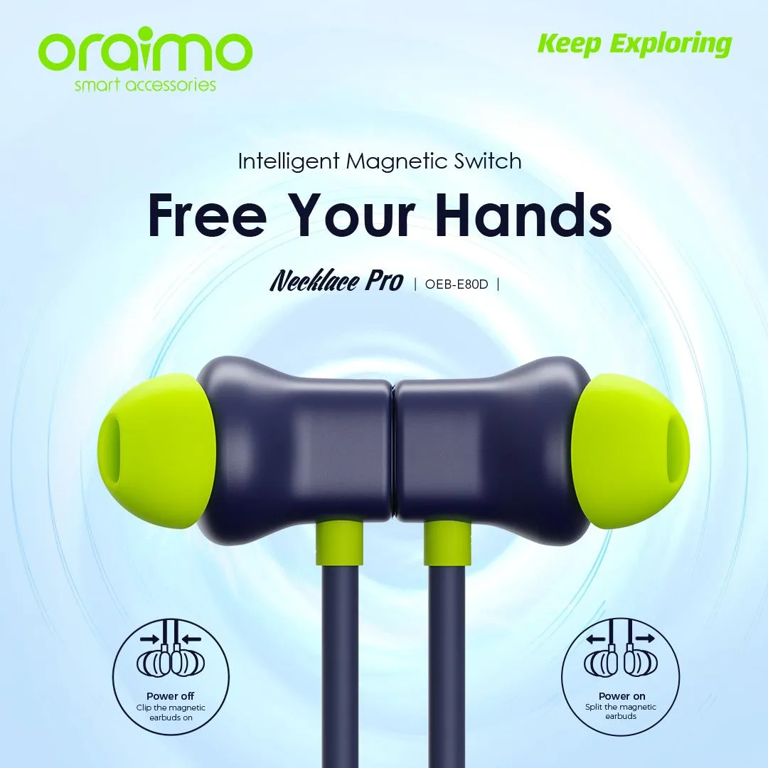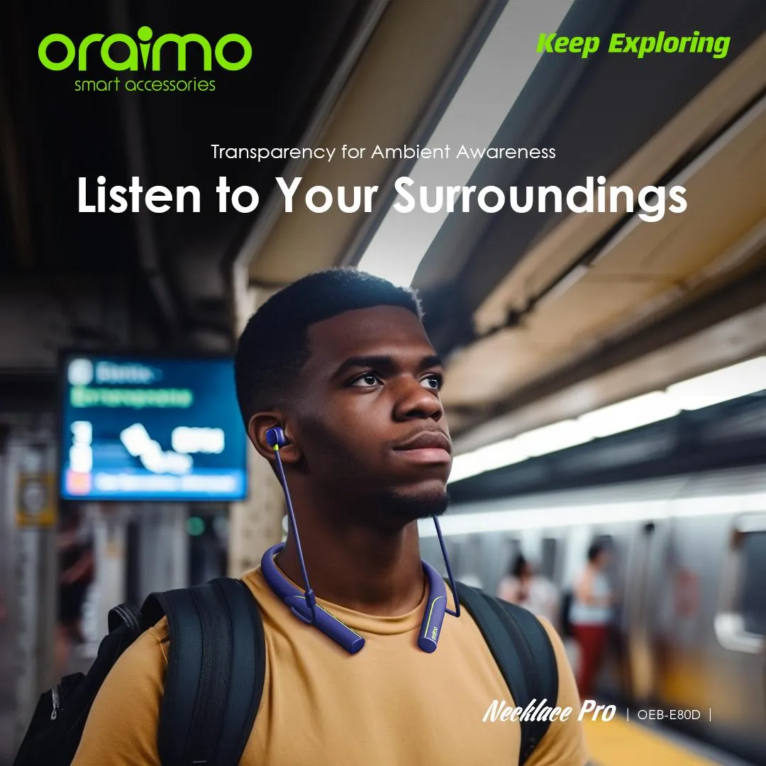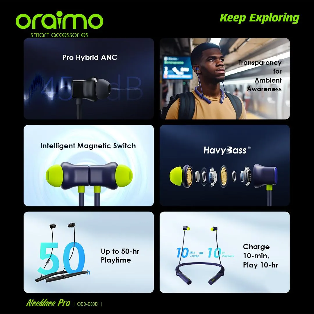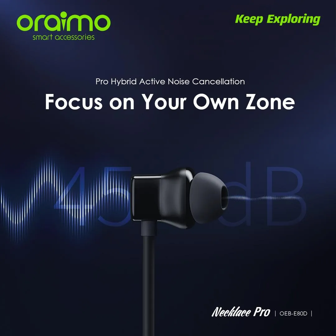 - The Oraimo Necklace Pro ANC Wireless Headphones (OEB-E80D) deliver an exceptional audio experience through their Pro Hybrid Active Noise Cancellation, eliminating up to 45dB of noise. Moreover, this advanced ANC technology, combined with a proprietary algorithm, ensures you enjoy an immersive sound environment with fewer distractions. Additionally, the Transparency Mode allows you to stay aware of your surroundings, blending ambient sounds naturally when needed. Furthermore, the intelligent magnetic switch feature automatically powers off the earbuds when snapped together and powers on when separated, offering tangle-free convenience.