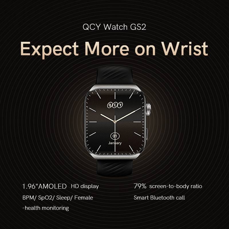 - The QCY GS2 Smart Watch is an embodiment of innovation and style, designed to meet the needs of modern users who seek both functionality and elegance in their wearable devices. With its impressive 1.96-inch AMOLED touchscreen, the QCY GS2 offers a vast canvas for your digital life, making every interaction more immersive and enjoyable. Moreover, the display’s high resolution of 410×502 ensures that every detail is crystal clear, while the 60Hz refresh rate guarantees smooth and responsive navigation, perfect for a seamless user experience.