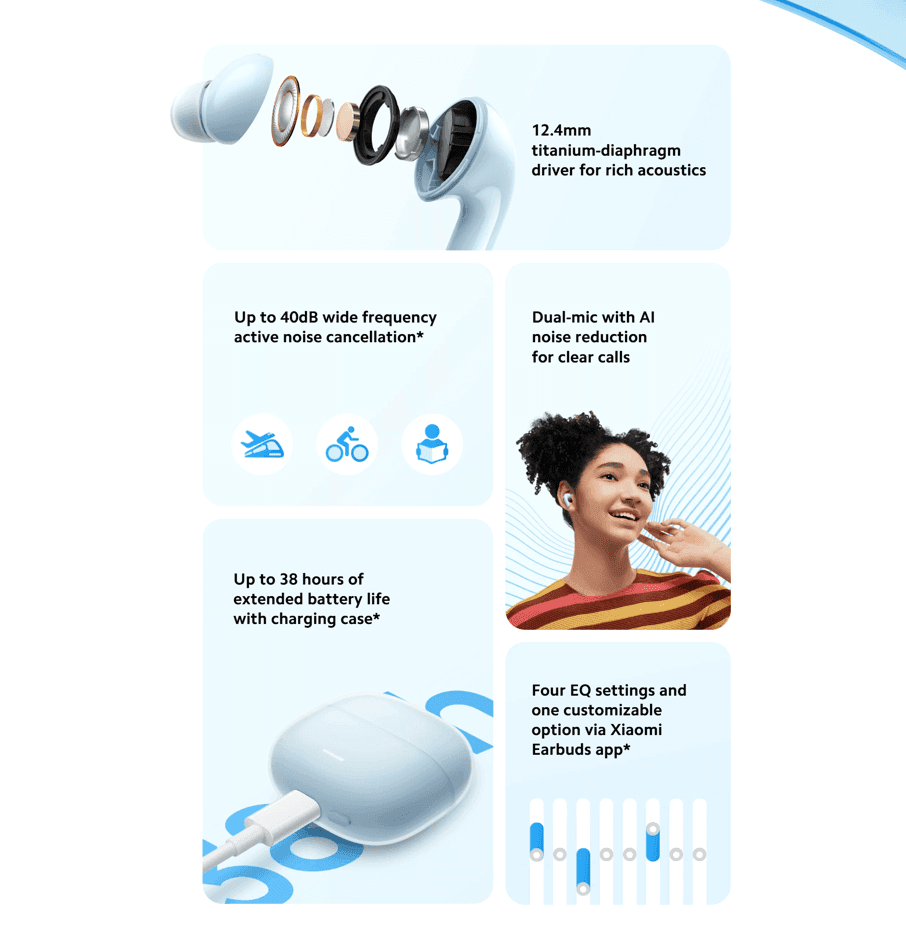 - These earbuds are designed to keep up with your busy lifestyle. Featuring an extended battery life, the Redmi Buds 6Lite ensures hours of uninterrupted use, perfect for long commutes or workout sessions. Plus, the quick-charging capability gets you back to enjoying your music in no time. Using the Xiaomi Earbuds App, you can explore four preset EQ settings or customize your own, tailoring the sound to match your preferences.