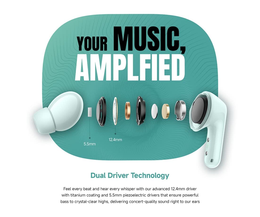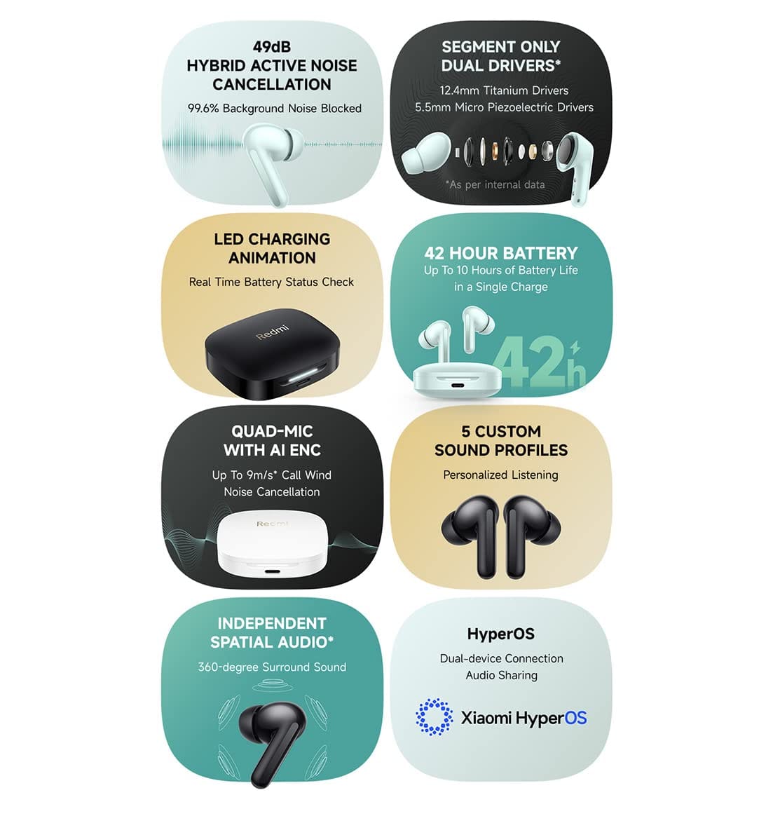 - Discover the ultimate sound experience with the Redmi Buds 6SuperANC Earbuds, a perfect blend of advanced technology and premium audio performance. Featuring Dual Driver Technology, these earbuds combine a 12.4mm titanium-coated driver and a 5.5mm piezoelectric driver to deliver crystal-clear highs and powerful bass. Whether you’re listening to music or enjoying a podcast, the Redmi Buds 6 ensures vibrant, concert-quality sound.
