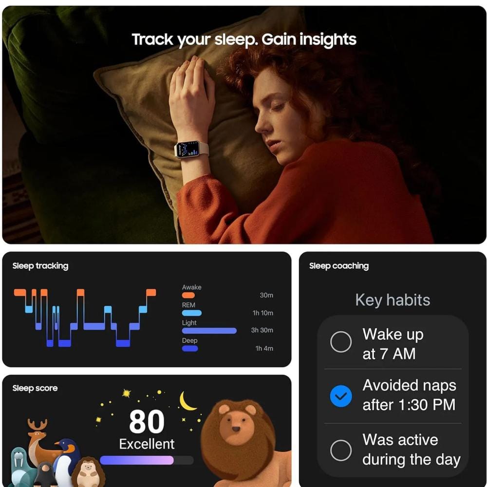 - Advanced Fitness & Health Tracking: The Galaxy Fit3 offers 100+ workout modes, allowing you to personalize your training sessions for better performance. Additionally, its comprehensive reports give you deep insights into your fitness journey. The watch also features silent sleep monitoring to help you improve sleep quality and heart rate monitoring to keep track of cardiovascular health.