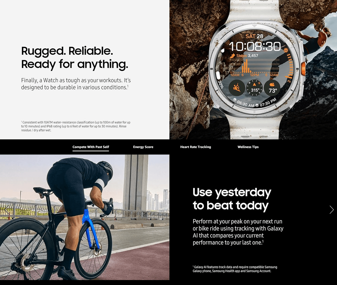 - Whether you’re an outdoor enthusiast or a fitness buff, the Samsung Galaxy WatchUltra is your ultimate partner for achieving goals and pushing boundaries.