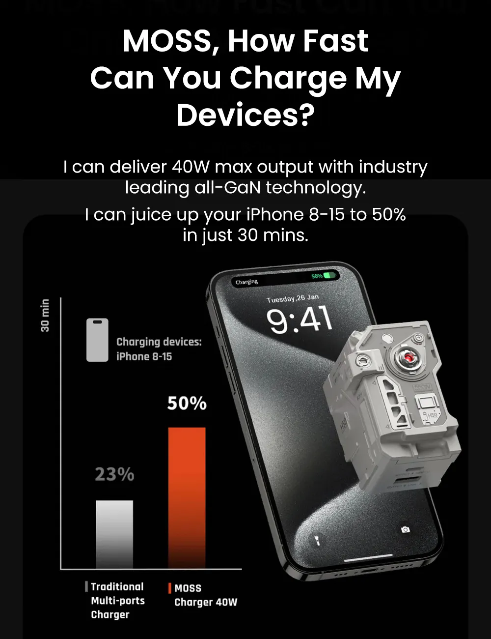 - Delivering an impressive 40W max output, the MOSS charger harnesses the power of industry-leading GaN technology to charge your devices rapidly. Whether it’s your iPhone, Android smartphone, or tablet, you can expect a significant charge boost in minimal time. In fact, you can power up your iPhone from 0 to 50% in just 30 minutes.