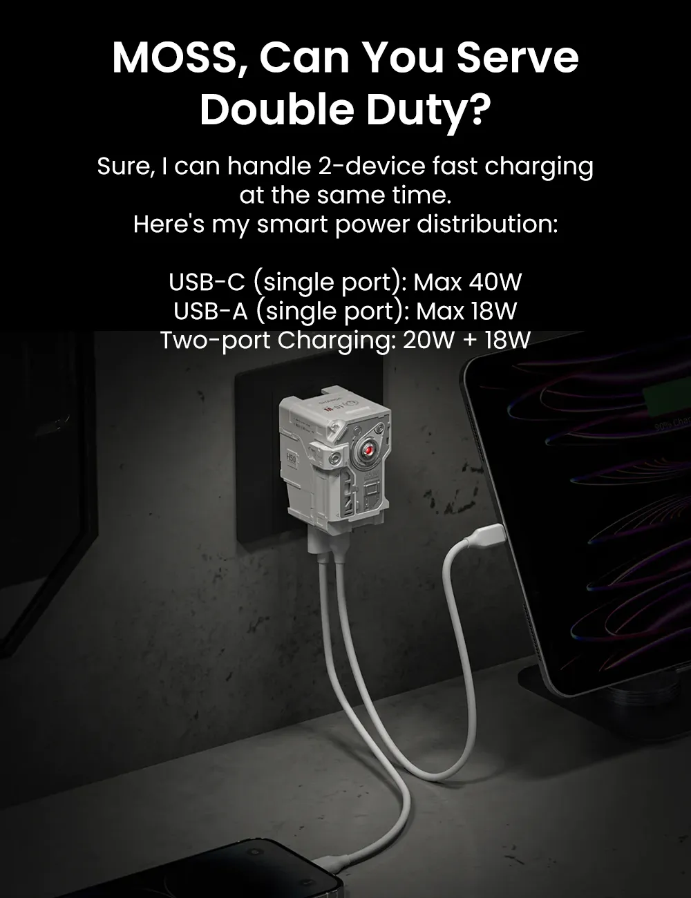 Versatility and Efficiency:The MOSS charger caters to your charging needs with its dual-port design, featuring one USB-C and one USB-A port.This allows you to charge two devices simultaneously without compromising charging speed. Additionally, the charger supports a wide range of charging protocols, ensuring compatibility with a vast array of devices.