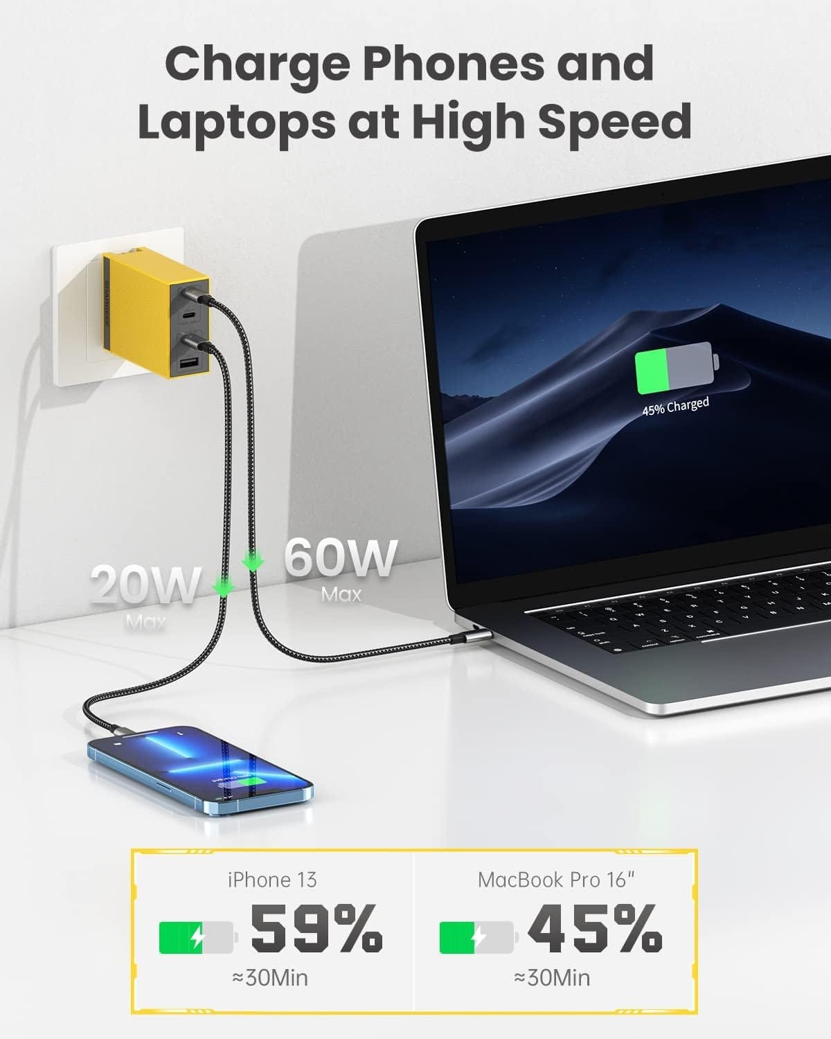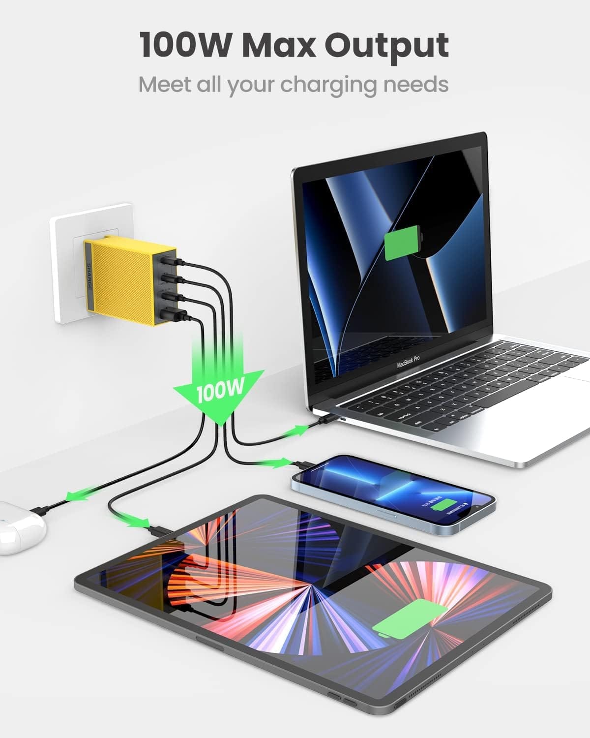 - The Shargeek 100W Pro GaN Charger designed to revolutionize your charging experience with its exceptional speed and versatility. With a maximum output of 100W, this charger ensures that your devices, whether it’s a laptop, tablet, or smartphone, charged rapidly and efficiently. For instance, it can power your MacBook Pro 16” from 0% to 45% or your iPhone 13 from 0% to 50% in just 30 minutes. Therefore, you can rely on this charger to keep your devices ready for use in no time.