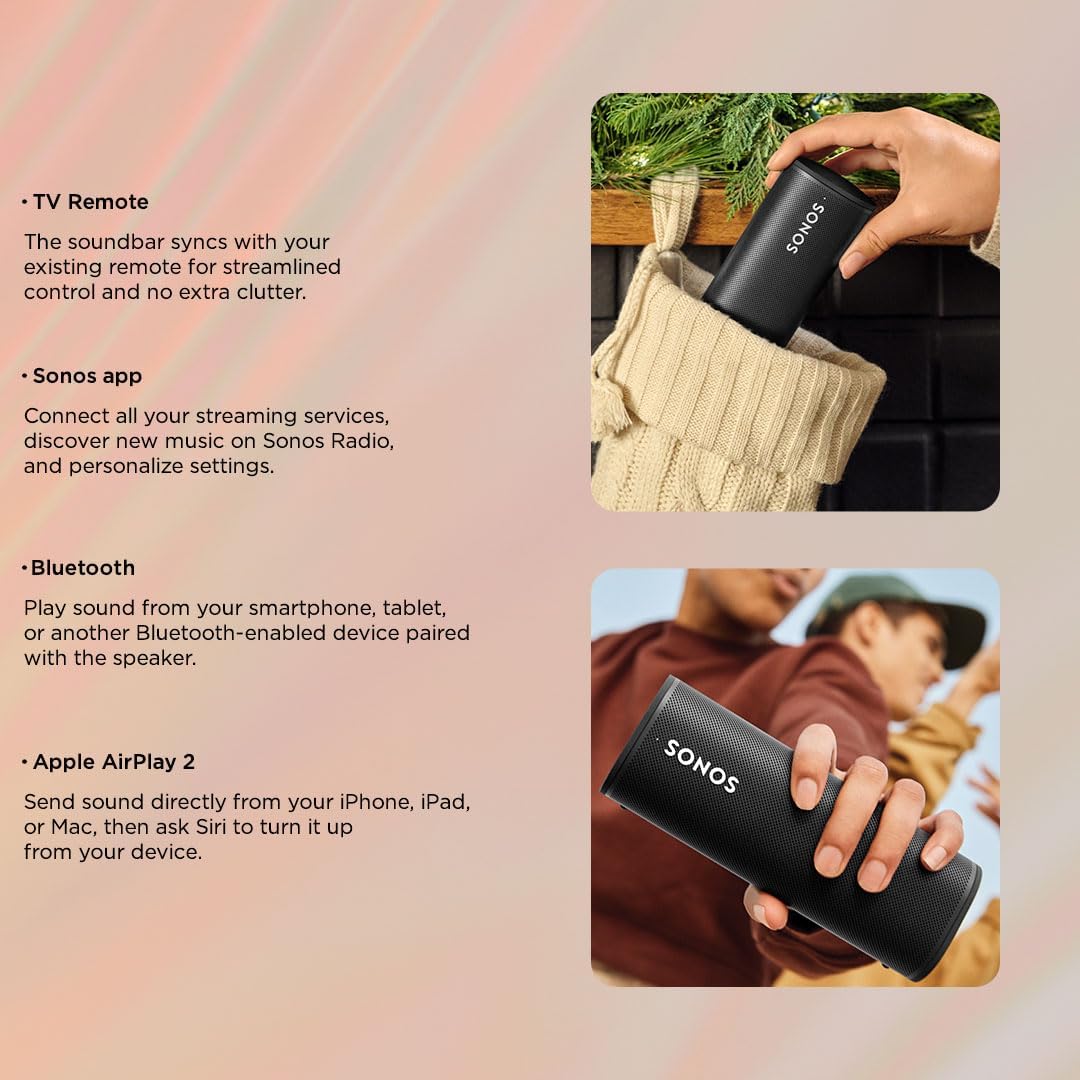 - The Sonos Roam Smart PortableSpeaker offers premium sound in a compact, durable design. With both Wi-Fi and Bluetooth connectivity, it seamlessly transitions between home and outdoor use. Automatic Trueplay tuning optimizes audio quality, ensuring a balanced and immersive listening experience wherever you go.
